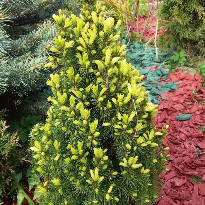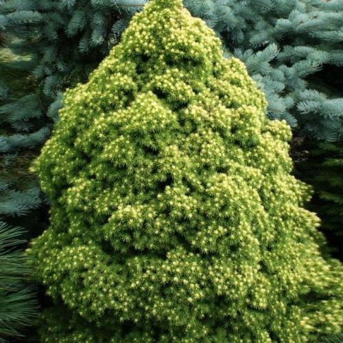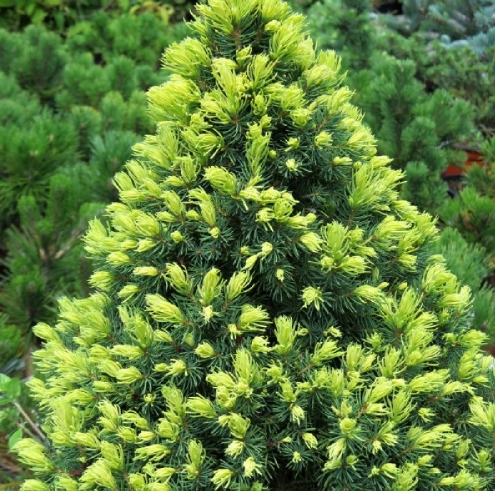 Ель канадская «Rainbow`s End» / Рейнбоуз энд — меденнорастущий карликовый сорт с плотной конической кроной, высотой до 1 м, с короткой тёмно-зеленой хвоей и вертикально расположенными побегами. Весенний прирост светло-кремово-зеленого цвета, летний имеет более интенсивную кремово-желтую окраску. Рекомендуется для каменистых садов, альпинариев, для выращивания в контейнерах, на крышах, террасах, балконах.