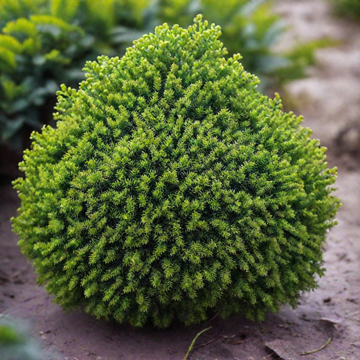 Ель сизая «Alberta Globe» представляет собой классический и широко востребованный карликовый сорт, являющийся мутацией известной ели «Conica». Ее форма практически идеально шаровидная, с возрастом иногда вытягивающаяся в широкий, плотный конус. Растение отличается исключительно медленным темпом роста. Годовой прирост не превышает 2-4 см в высоту и ширину. К десятилетнему возрасту размеры растения обычно составляют около 30-40 см в диаметре, а максимальная высота взрослого экземпляра редко превышает 1 метр. Крона невероятно плотная, напоминающая мягкую, колючую подушку. Ветви короткие, густо ветвящиеся, радиально расположенные. Хвоя тонкая, мягкая на ощупь, длиной 6-9 мм, окрашена в свежий, светлый зеленый цвет с легким сизоватым оттенком. Иголки расположены очень тесно, создавая абсолютно непроницаемую поверхность. Растение сохраняет четкую геометрическую форму без какого-либо формирования, что является одной из ключевых характеристик сорта. Корневая система компактная, поверхностная.