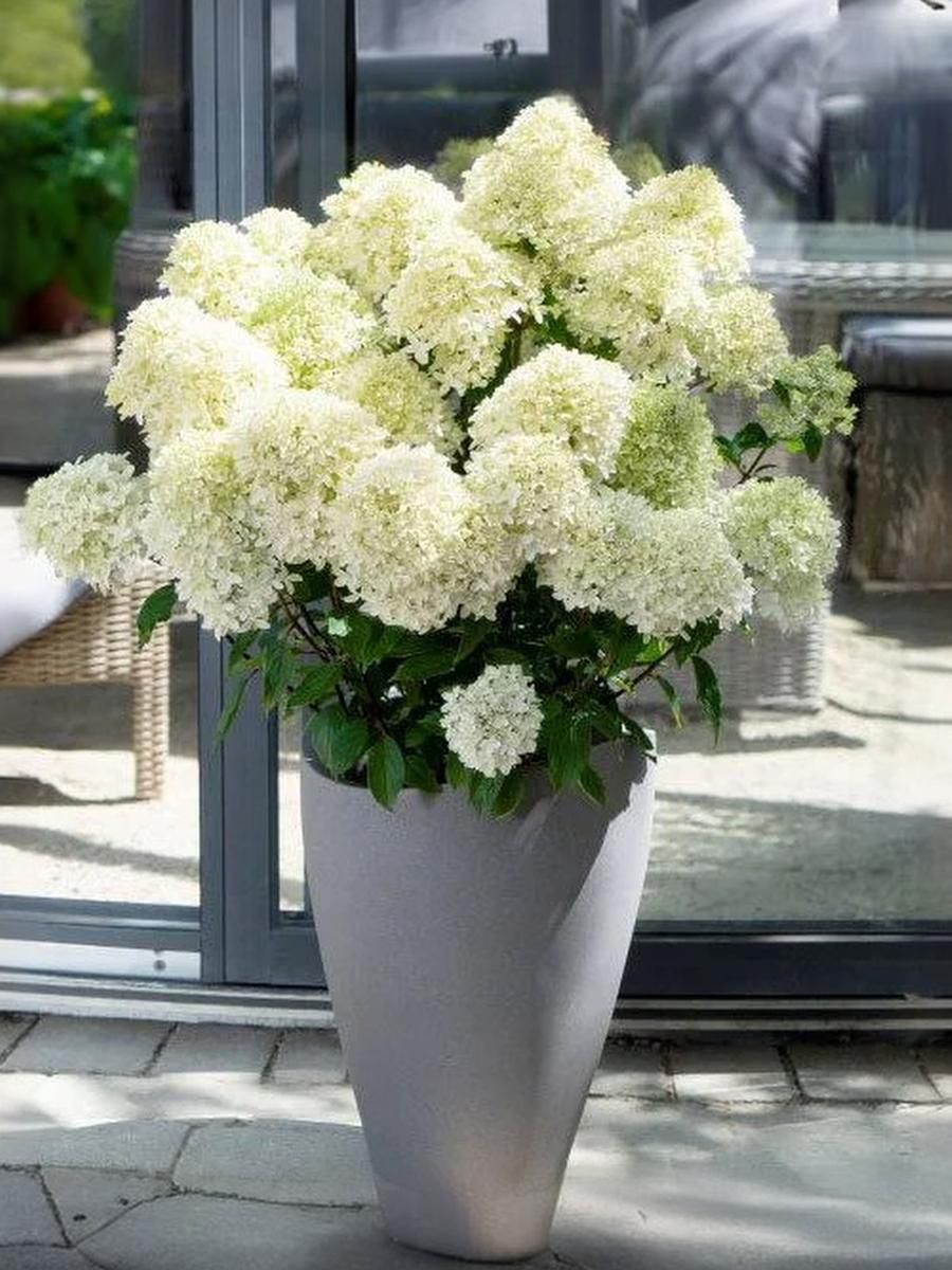Гортензия метельчатая » Whitelight» — в отличии от многих других крупных метельчатых гортензий, «Whitelight» имеет компактную, прямостоячую форму куста, достигающего в высоту до 100 см, при умеренной ширине кроны. Его побеги обладают удивительной прочностью; они надежно удерживают огромные, плотные соцветия даже во время сильных осадков, не допуская их полегания или деформации. Темно-зеленая листва с благородным матовым оттенком служит совершенным холстом для главной драгоценности растения — его пышных соцветий, которые изящно сужаются к вершине, формируя классические конусовидные метелки значительного размера. Whitelight» начинает свое цветение в середине лета, очаровывая наблюдателя нежными, чуть зеленоватыми бутонами, которые по мере раскрытия стремительно превращаются в ослепительно-белые, сияющие на солнце соцветия. К концу сезона, отражая постепенный уход лета, на лепестках могут проступать тончайшие пастельно-розовые нюансы, создающие эффект легкого осеннего румянца. Зимостойкость сорта позволяет ему без ущерба переносить суровые морозы, что значительно упрощает уход за этим роскошным гостем в ландшафтных композициях.