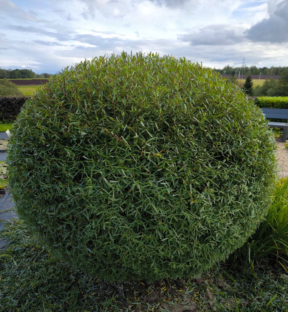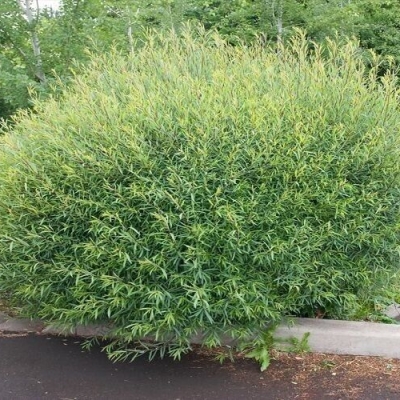 Этот карликовый сорт достигает высоты около 1,5 м и отличается быстрым темпом роста. Крона растения плотная и изначально имеет шаровидную форму, однако при желании можно придать ей любую другую геометрию. Побеги у ивы многочисленные и очень тонкие, что придает растению легкость. Листья имеют ланцетную форму, они с матово-зеленой окраской сверху и синевато-зеленой или сизой снизу. Размер листьев мелкий, что делает их особенно привлекательными. Цветение происходит в мае. Сначала сережки красноватые, а затем становятся желтоватыми. Это создает интересный контраст с листвой и добавляет декоративности кустарнику.