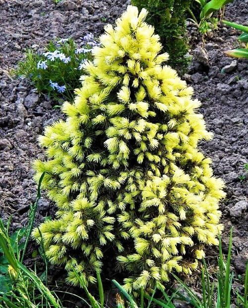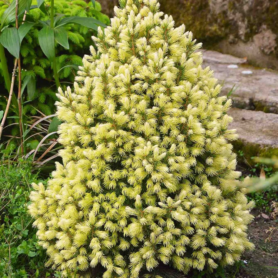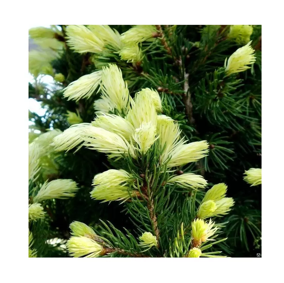 Ель сизая «Daisy’s White» – это уникальный карликовый сорт, знаменитый своим драматичным сезонным изменением окраски молодых приростов. Растение отличается очень медленным темпом роста, формируя плотную, правильную коническую крону. Высота дерева за 10 лет в отечественном климате, схожем с канадским, достигает всего 0,8-1 м. Максимума своего роста оно достигает к 30 годам. Взрослое дерево вырастает до 1,5 м в высоту и 0,8 м в диаметре кроны. Годовой прирост составляет около 3-5 см. Крона густая, с короткими, жесткими ветвями, обильно покрытыми тонкой хвоей. Основной цвет хвои – насыщенный темно-зеленый. Главная декоративная особенность проявляется дважды за сезон. Весенний прирост (май-июнь) имеет яркий, сливочно-желтый, почти белый цвет. Эти нежные побеги контрастируют с темной старой хвоей, создавая эффект искрящегося покрытия. Постепенно, в течение нескольких недель, этот прирост зеленеет. В середине-конце лета (июль-август) происходит вторая волна роста. Летний прирост также окрашен в светло-желтые тона, но менее интенсивно, чем весенний. К осени вся хвоя приобретает ровный зеленый цвет. Такая двукратная смена окраски делает растение живым и меняющимся элементом сада в течение всего теплого сезона. Именно этот эффект выглядит особенно декоративно — иголки до 9 мм длиной сохраняют контрастные светлые концы, и яркое основание.