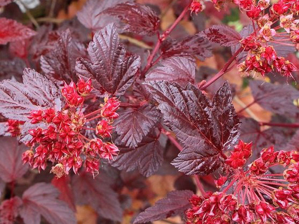 Листва сорта «Andre» является его ключевой декоративной чертой. Листья крупные, типичной для вида лопастной формы, с рельефным жилкованием и зубчатым краем. Их окраска представляет собой мастерское сочетание пурпурных и бронзово-медных тонов. При распускании весной листья имеют яркий, насыщенный винно-красный или свекольный цвет с легким оранжево-медным отливом. По мере перехода к лету основной фон становится более глубоким, темно-бордовым, при этом молодые приросты на концах побегов могут сохранять более светлый, красновато-бронзовый оттенок, что добавляет кусту внутренний объем и игру цвета. Осенняя окраска включает в себя гамму от красных и пурпурных до бронзовых тонов, продлевая декоративный эффект.